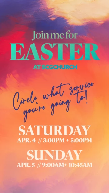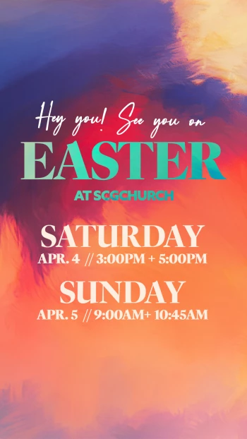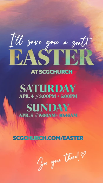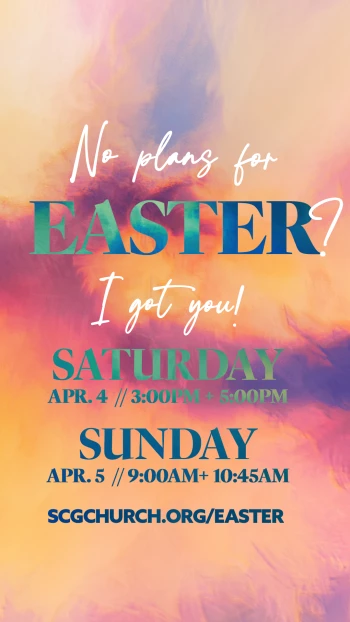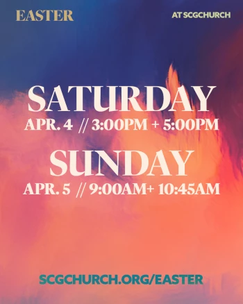 You're invited to celebrate EASTER with us at SCGCHURCH! There is no time of year that brings us more joy than this weekend! We’ll reflect on Jesus’ sacrifice, remember His love for us, and rejoice in the new life His resurrection promises. The kids will have a blast with activities designed specifically for them in our SCG Kids program available for infants-5th grade at each service! We can't wait to see you this Easter!